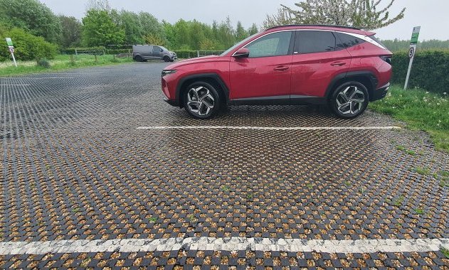 The PERFO tiles provide a permeable surface allowing normal drainage of the parking area.